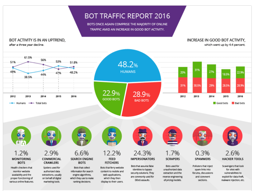 Just because 52% of traffic is from bots doesn't mean your analytics are all out by a factor of 2 though. Whilst bots will show up in the logs, most good bots won't show up in Google analytics because Google analytics knows not to count them. Search engine bots for example will not be counted in analytics, nor will feed fetchers usually. However impersonator bots are deliberately trying to imitate a users, and thus often will wrongly inflate view totals in analytics. This leads to a key problem that bots pose for marketers- ad fraud.