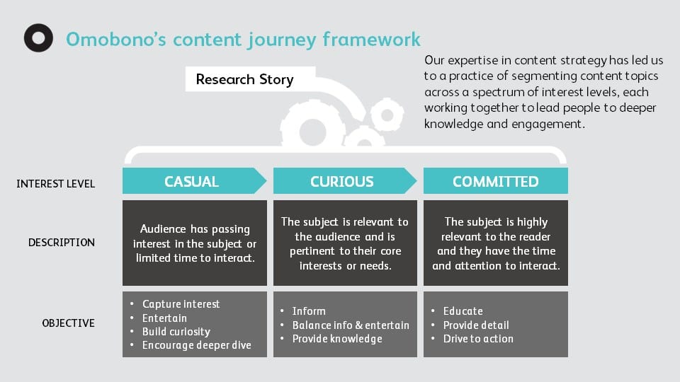 Brosan highlights the ‘casual/curious/committed model’ developed by Omobono, which illustrates how audience needs might vary and how individual pieces of content can be flexed to respond to those needs.