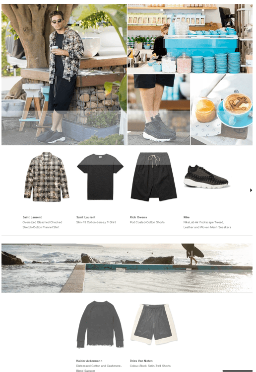 Mr. Porters website publishes in-depth editorial including interviews with well-known celebrities such as Hayden Cox and others, along with beautiful photography. Each section is provided with expandable sections that include the details of the products featured in the photos.