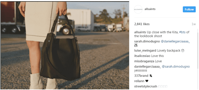 A number of brands leverage user-generated content on social media to encourage users to make a purchase since user generated content on a website or in a campaign can increase the conversion by 29 percent. All Saints, for example, uses user generated content to help other customers make purchase decisions. The images posted by satisfied customer's act as product endorsements and the shoppable elements make purchasing easier.