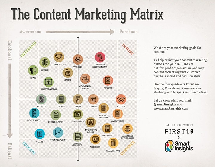 You should also plan to utilise other forms of content in your marketing plan, and map them on our content marketing matrix to consider what mix of methods will be most effective.