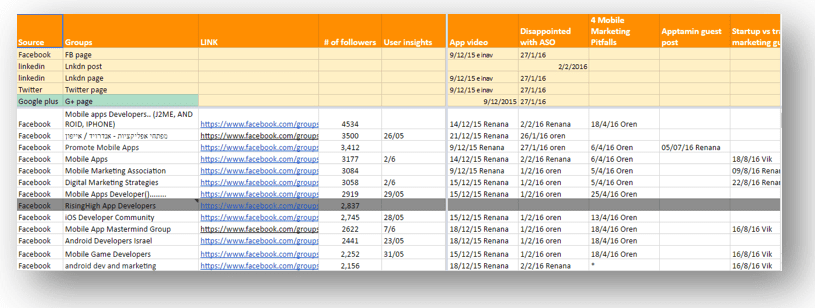 Then we set up a Google sheet table (open to all team members), with all these groups (each group in a different row) and in the columns, we add the Group link, # of followers, Type of group per the target audience (e.g., developers / marketers).