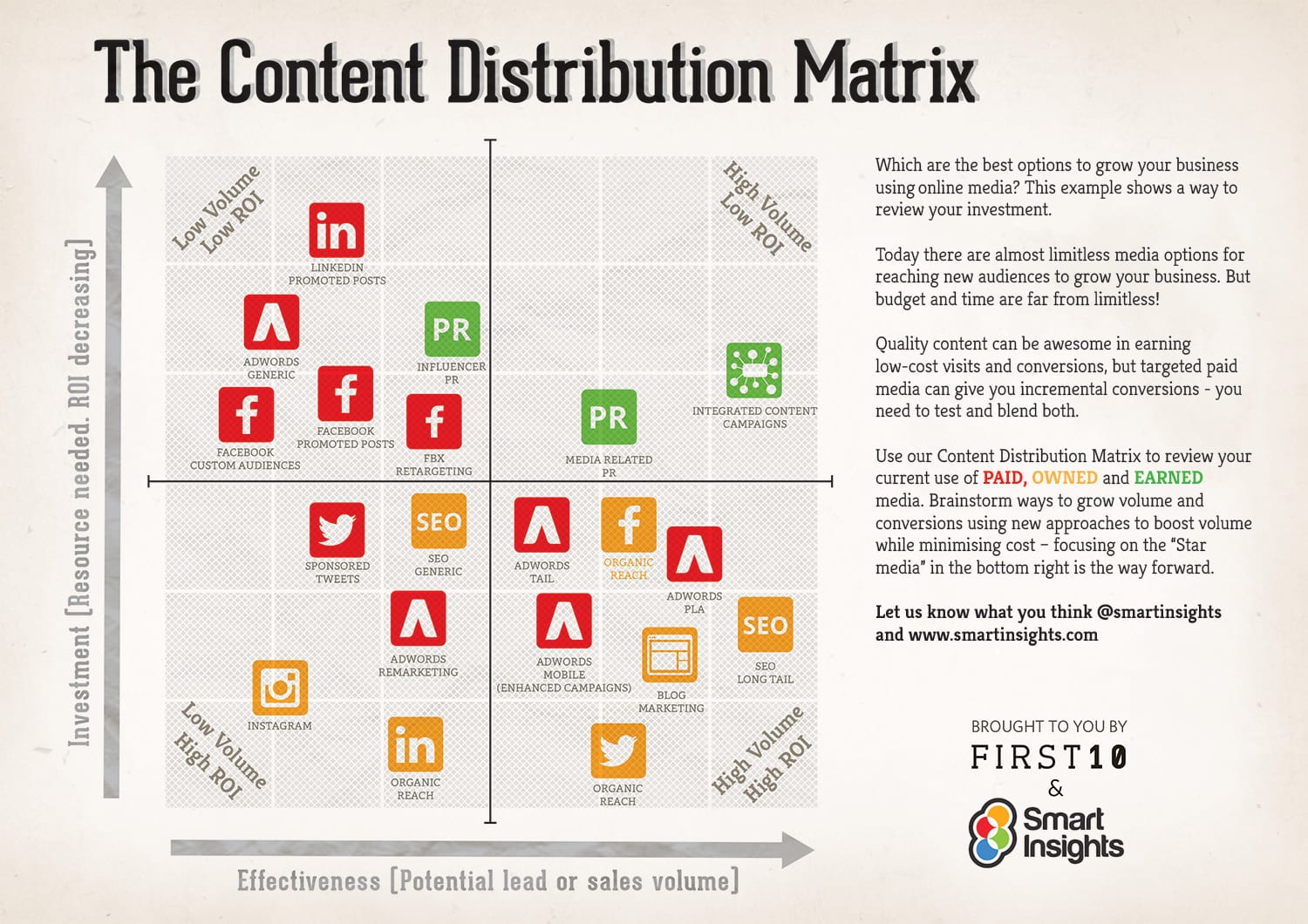 Smart Insights’ new Content Distribution Matrix helps marketers to review the best options for promoting content by identifying the most effective means of distributing their content in generating site visits, leads or sales compared to the level of investment.