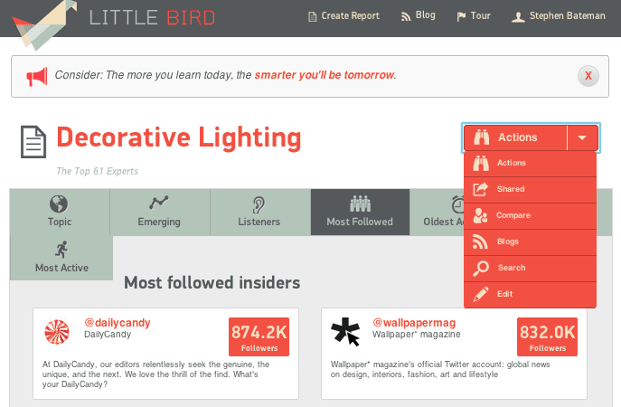 The strength of Little Bird is that it helps you get out of a rut and view content trends in adjacent content verticals. So, for instance whist researching content marketing opportunities for a client in the home electrical fixtures vertical I was able to look at content published by insiders in the residential design field and see the topics in “decorative lighting” and “smart homes” where new opportunities to market with fresh content to new audiences lie. By providing me with lists of the people who hold the most sway within these industry verticals Little Bird works as my cheat sheet to identify influential Twitter users, bloggers, brands and the content they are creating.