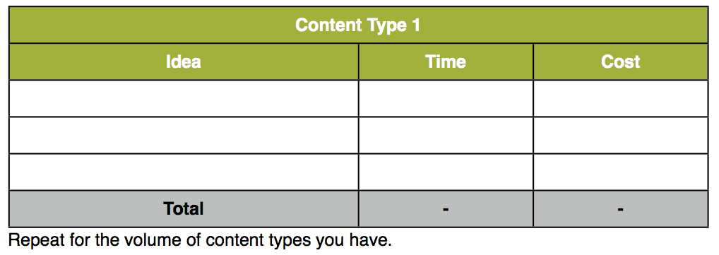 Pulling together all the notes can be quite a difficult task, I recommend organising ideas into content types in a table much like the below. This way you can quickly understand associated skills, time & costs with each idea to see how palatable they are against budgets & objectives.