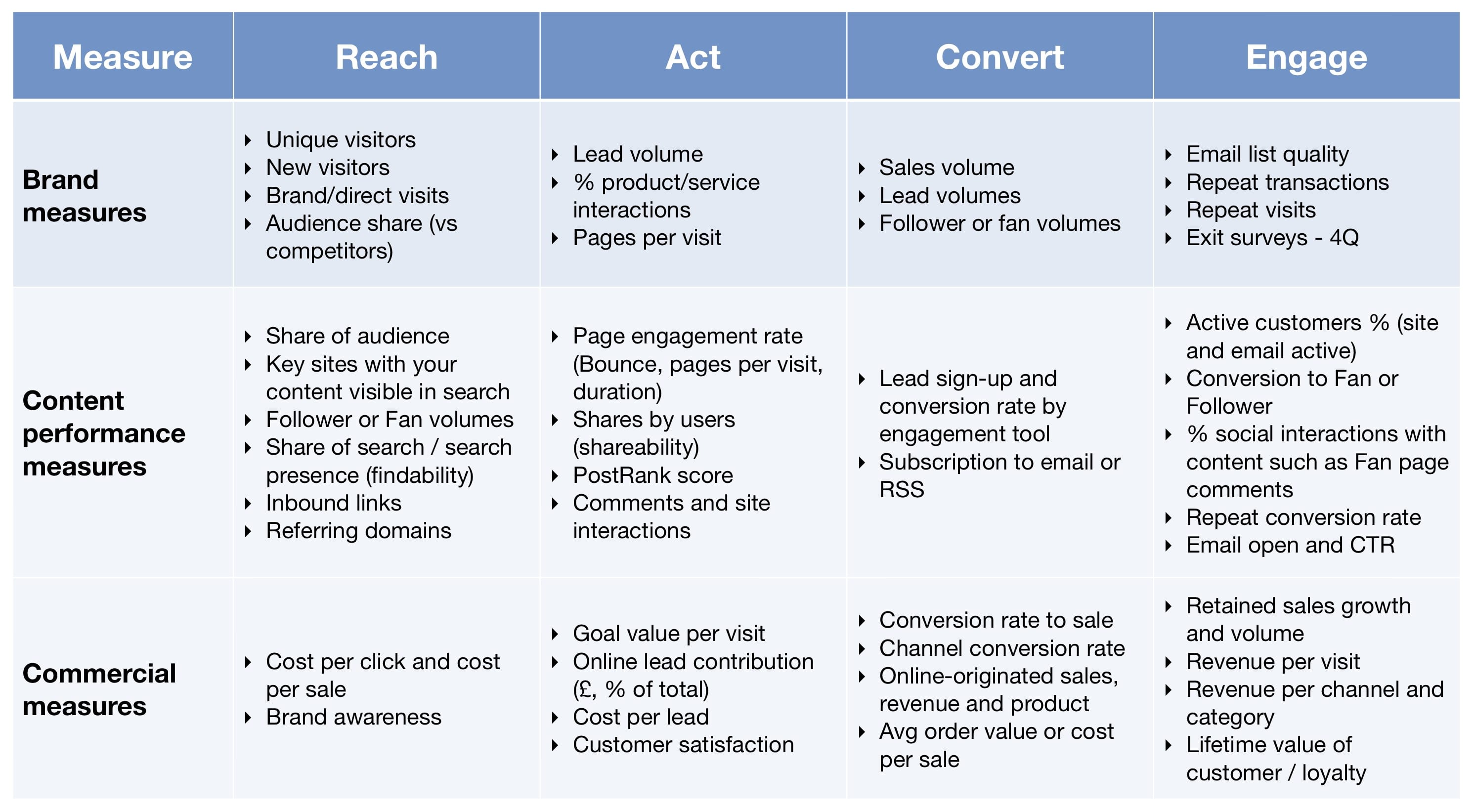 Content requires objectives just like any other marketing technique, to set objectives we need to understand what content can influence. The KPI matrix that Smart Insights has developed should help you understand the kind of metrics you could utilise. Based on the RACE framework, it will allow you to measure how the content influences things like traffic to the website (largely SEO & referral related) as much as its effect on conversion & site engagement. The image below is explained in this article by Dan Bosomworth on measuring content marketing.