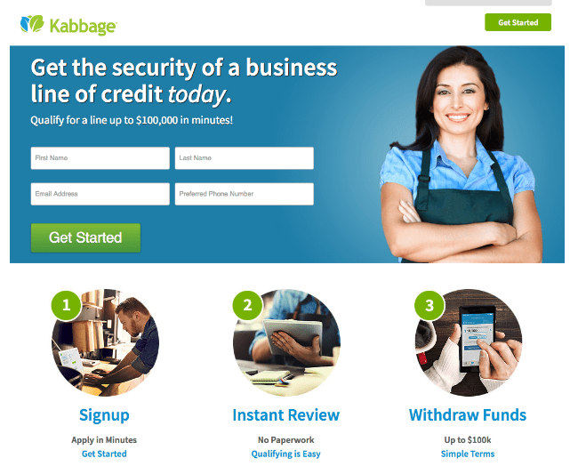 Take the Kabbage landing page below, for example. The headline emphasizes “today” in italics and the subheadline states business owners can get a line of credit in minutes:
