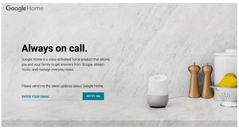 Most often, the reason anyone is on your landing page is because they want to know more about you, your product, or your service. Make it easy for them to get that information with CTAs, that say: “Try Our New Feature” or “Notify Me” like Google Home does: