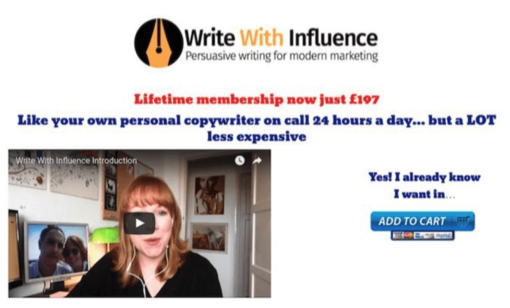 Make sure your CTA states this clearly. CTAs that work are: “Speak with a Sales Representative Now,” or: “Add to Cart,” like Write With Influence employs here: