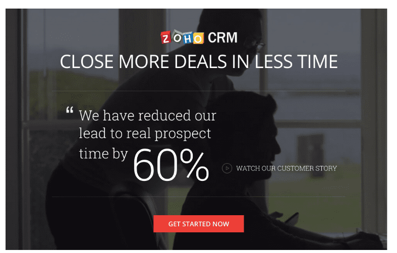 Zoho CRM’s landing page uses a customer’s testimonial to convince visitors to get started with their product: