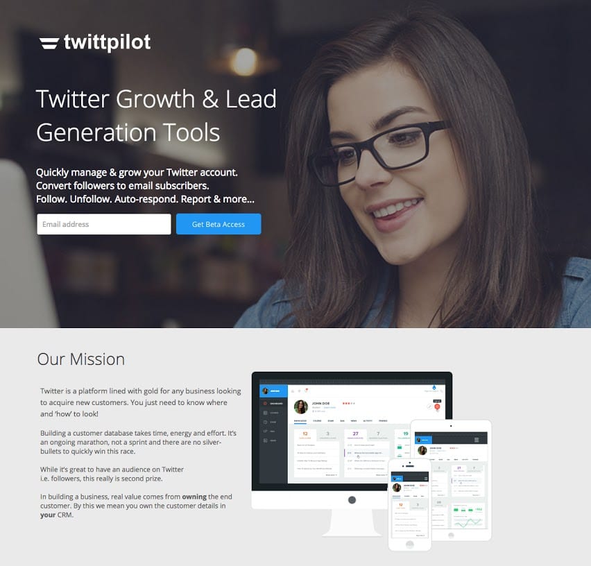 Everything that appears on TwittPilot’s landing page is telling the brand story: