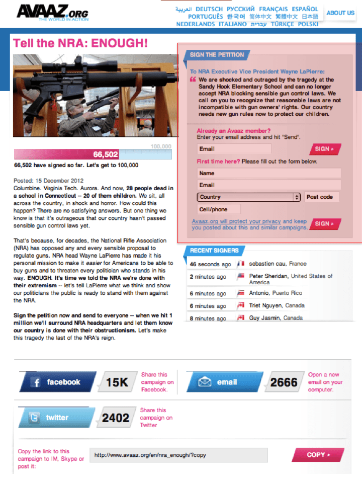 The good: example charity landing page encouraging visitors to take action - Avaaz