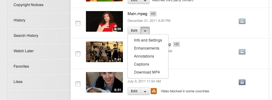 4. Find the video you want to add captions to and click on the downwards arrow next to the EDIT button for that video. Select ‘Captions’