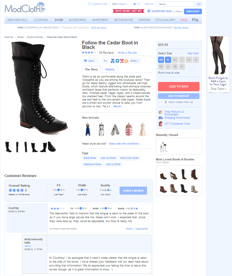 Another great feature of ModCloth’s product page is their customer reviews, which provides an overall product rating as well as more specific assessments of fit, width, and quality. A potential customer can’t try on the boot before they buy it but with this information, they know ahead of time whether it will be right for their size.