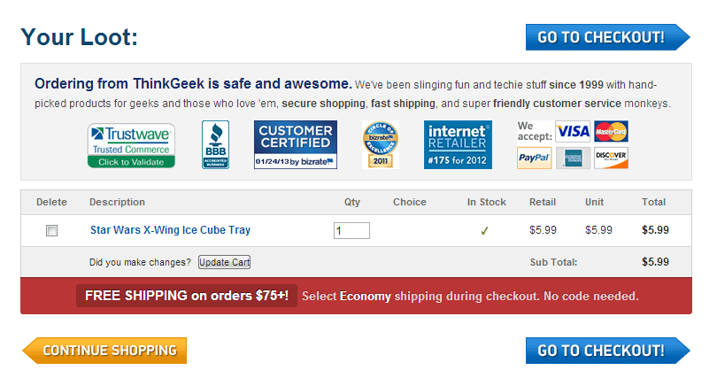 - Good example:When you add a product to your cart on ThinkGeek,you are given clear, intuitive instructions on how to navigate. The website follows ecommerce norms, placing the shopping cart in the top-right corner of their page header.