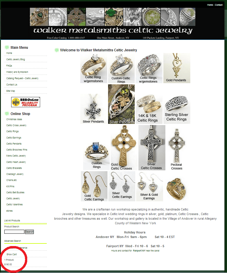 - Bad example: If you continue shopping on Walker Metalsmith’s site,you’ll be hard-pressed to figure out where your shopping cart went. It’s hidden far below the fold in the bottom-right corner of the site (here, circled in red), where no experienced online shopper would think to look