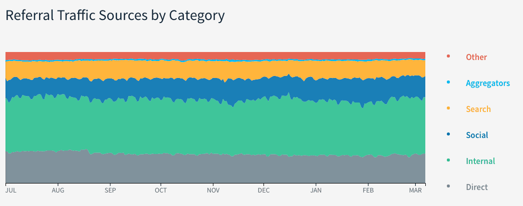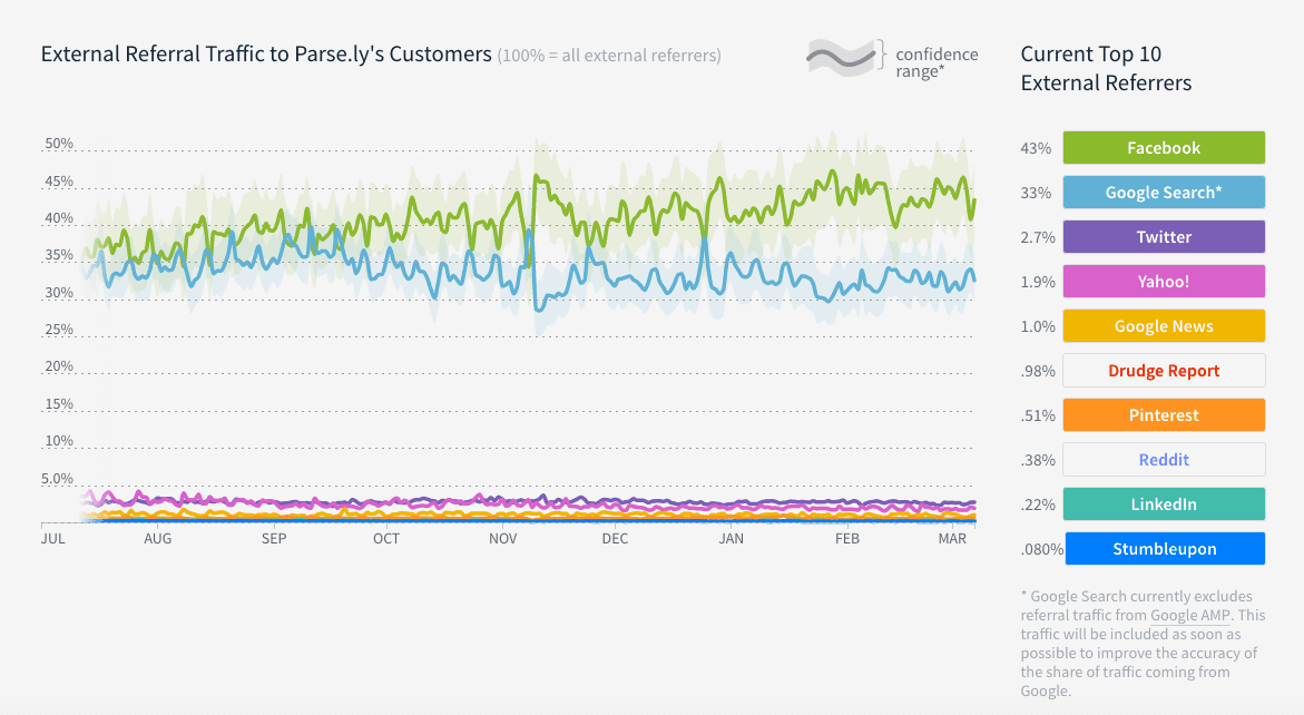 This research of traffic sources across large publishers who use the Parsely traffic reporting platform shows a very different pattern.
