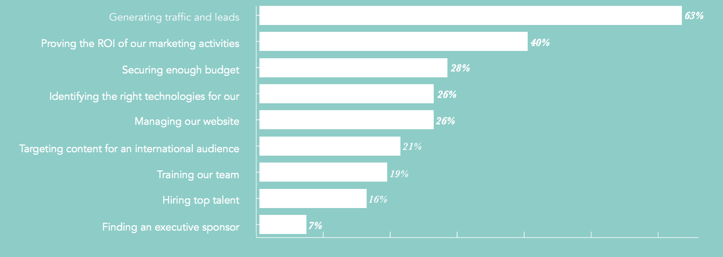 Although companies prioritize SEO and organic search traffic for inbound marketing projects, it is also one of their highest ranking challenges at 63%. Generating traffic and leads seem to be companies' top marketing challenges with proving the ROI of marketing activities next (40%) and securing enough budget (28%) in third place.