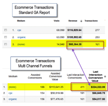 The reason for the difference is that MCFs do not take campaign cookies into account when reporting direct traffic. Because of this, they often have a larger “last interaction” conversion value for direct traffic when compared to the corresponding traffic source in other GA reports.