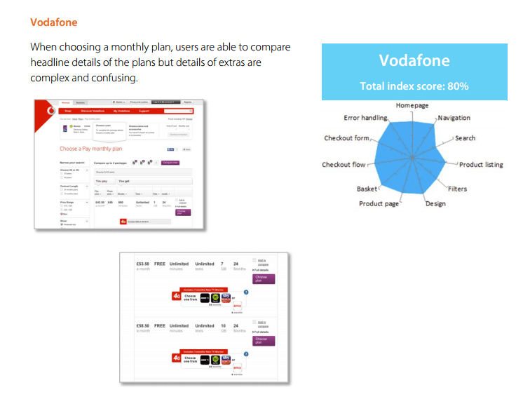 To score each site’s overall experience rating, a panel of expert UX professionals assessed the site in the context of a core user journey of browsing a new mobile phone..