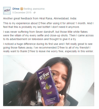 Taking a consumer example, see how D’free, an anti-dandruff lotion brand highlights their customer reviews not only on their website but also on their Facebook account along with the customer’s real-life image with their product to promote their brand.