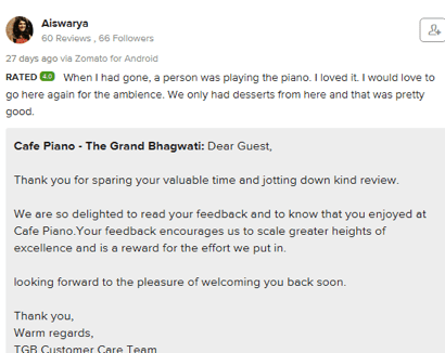 No matter, if it is a small thank you note. Responding them would make a good impression and it can turn a buyer into a repeat customer. This is what an Ahmedabad-based luxurious restaurant did when they found a customer praising them on Zomato. Voila! They just nailed it.