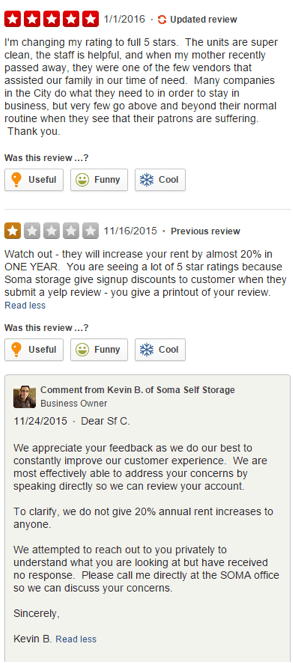 The below example shows how you can turn any situation, if dealt properly. In the first review, the customers seemed pretty annoyed and frustrated with the storage company. But the company responded thoughtfully and explained the real situation to the customer and also took out time to discuss the issue directly with the customer and resolved the issue. The result was amazing. The customer updated the review and gave them a 5-star rating and a great feedback. Such reviews can be helpful to any business, when it comes to brand building.