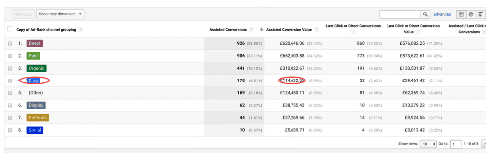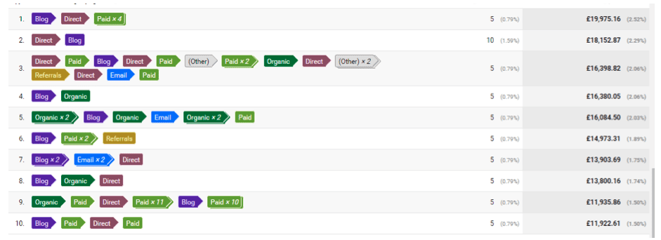 Perhaps the most useful here though is the “Assisted Conversions” report. This shows the interactions that a customer has had with the site leading up to a conversion, but not the final one – or “last click”. As you can see below, the blog has contributed to a substantial amount of transactions.