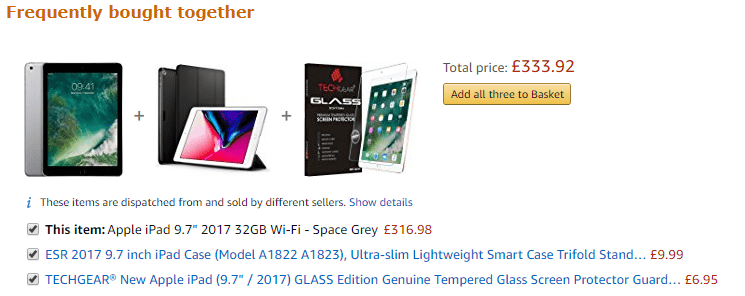 I was on a page promoting an iPad cover and on it, they display an upsell promoting an iPad. They also try to cross-sell a glass screen protector.