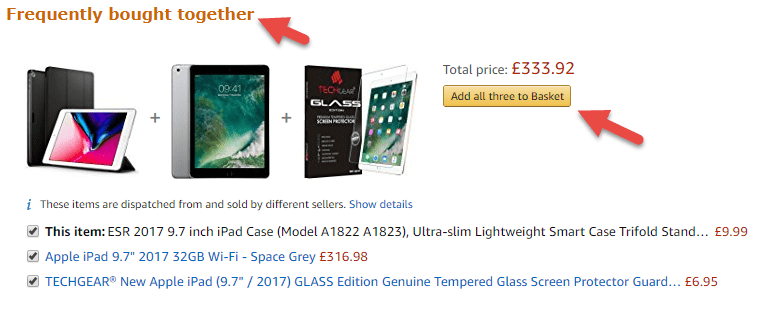 The wording ‘Frequently bought together’ adds social proof and is persuasive. And they make it easy to add all three products with a single click of a button.