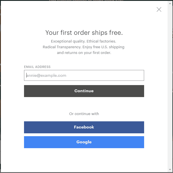 A company that is taking the right steps to convert all types of traffic to customers is Everlane. When you visit their website, the above popup turns up. It informs you that your first order ships free and asks you to sign up with your email address or Facebook or Google.