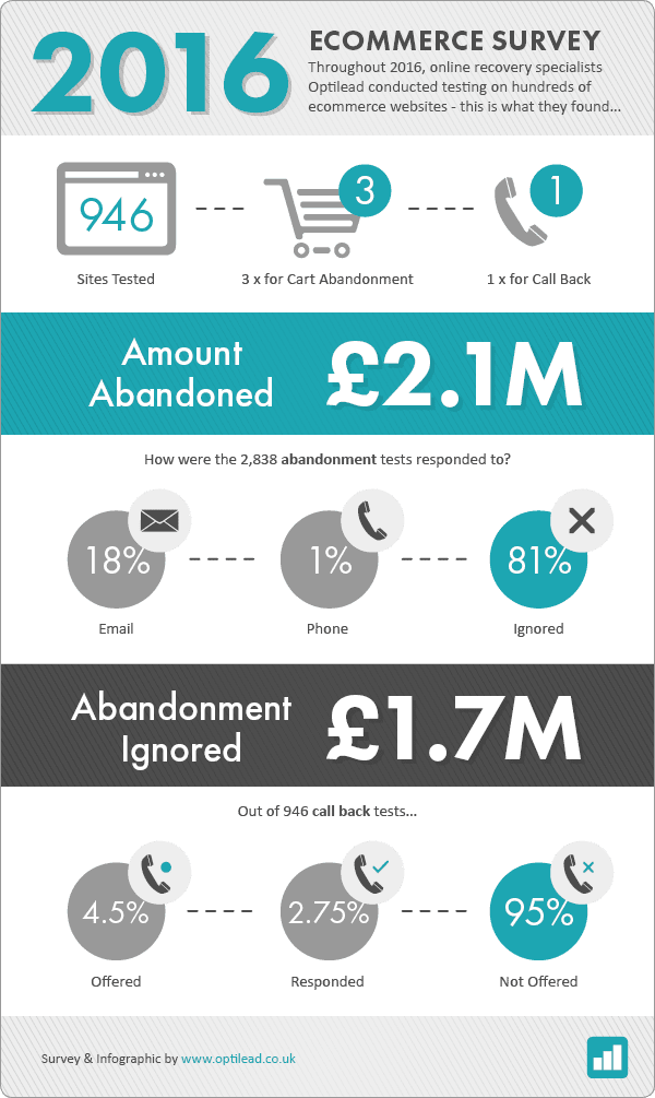 A 12-month survey for 2016 conducted by ecommerce recovery specialists Optilead has identified that 81% of online abandonment is totally ignored. This means that in the tests, valued at £2.1m, a staggering £1.7m of abandoned transactions were not followed up.