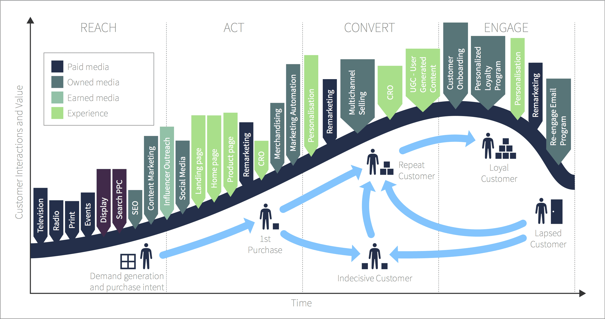 Headless commerce breaks down silos in your consumer-facing operations. Many e-commerce platforms haven't kept up with the demands of digital marketing strategies, including content management systems, which can't always address complex downstream integrations. Integration is key. That's why SmartInsights developed the below lifecycle ecommerce marketing model, to show the range of channels and where they fit into the customer lifecycle.