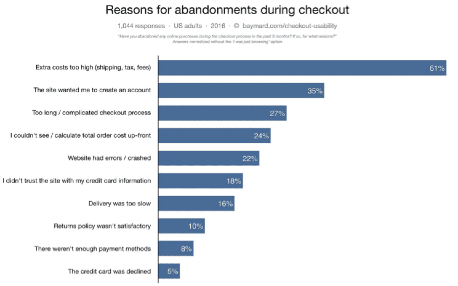 Simply googling ecommerce business problems reveals a troubling statistic: the majority of shoppers abandon their shopping cart before finalizing a purchase. In fact, according to Baymard Institute, 68.81% of online shopping carts are abandoned, and this figure is based on the average of 34 different studies. Clearly, something is going on here. Why are so many people abandoning their shopping cart? Sure, there are people who are just browsing and have no intention of buying, but they can’t account for the entire 68%, can they? Let’s see what the statistics have to say about it.