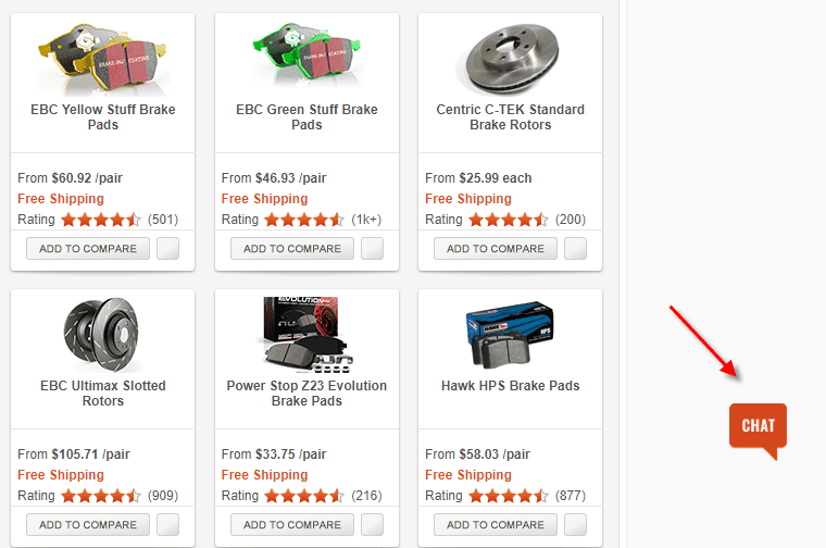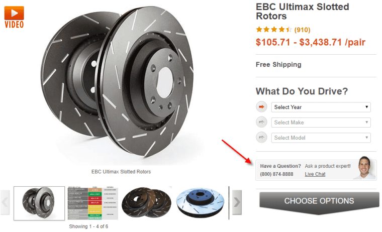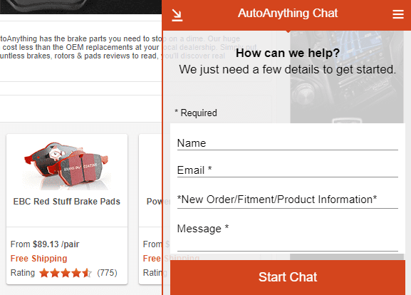 Note that they require an email address on their chat form, which was necessary in their case to reduce the number of ‘uncommitted’ chats. AutoAnything also places a static ‘chat now’ link in the ‘Have a question?’ panel on the Product page near the primary call to action (‘Choose Options’ in this case).