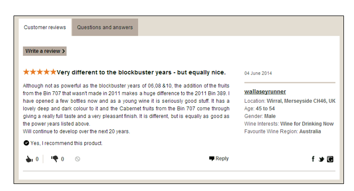 Berry Bros. & Rudd has an excellent approach to customer feedback, with FAQs, and detailed customer comments and profiles, which can help reassure visitors (e.g. 'that person is from my area and likes the same wine as me. I trust her judgement'). Up-and-down voting also filters out unreliable comments and promotes the best.