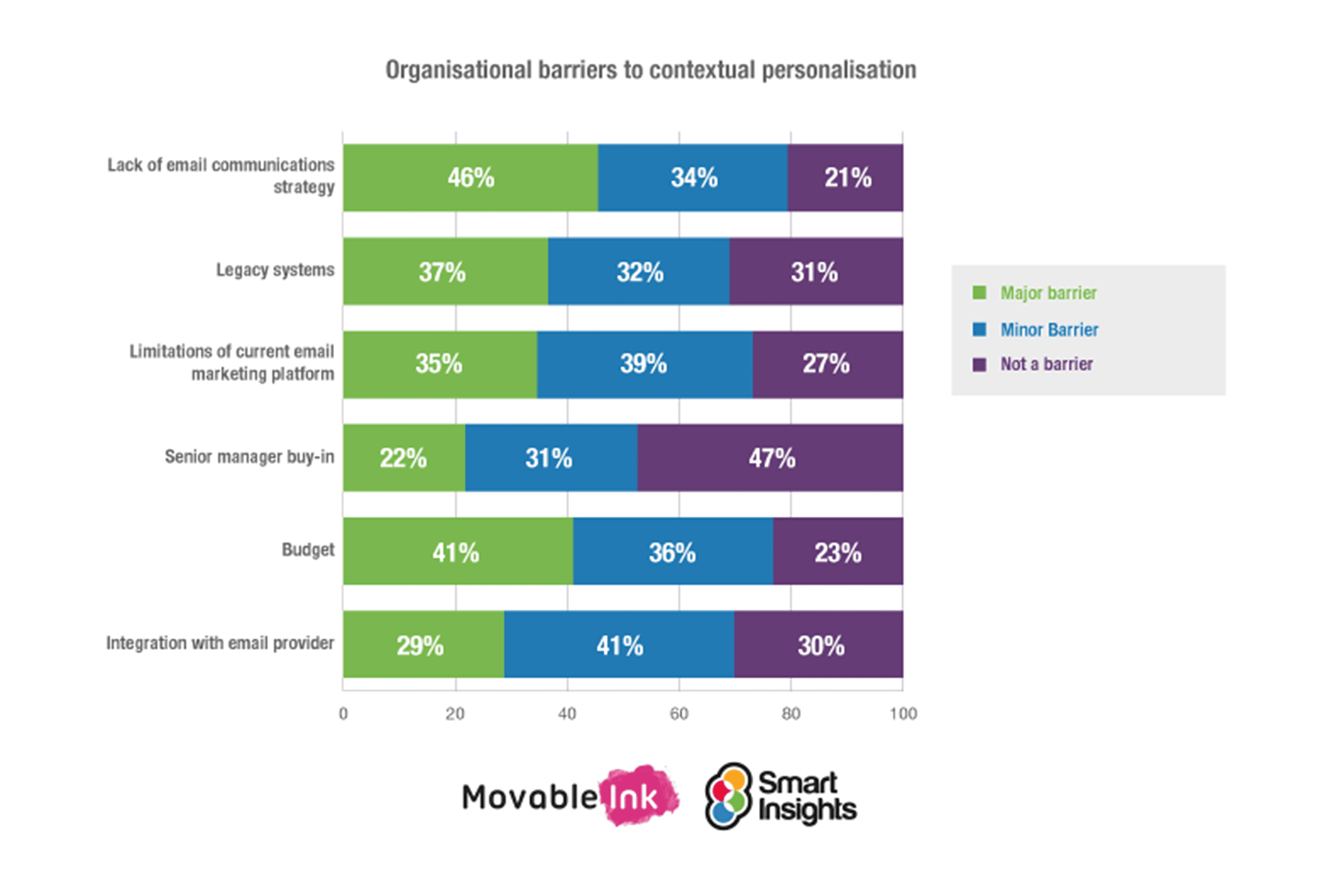 As can be seen in the chart above, budget, platforms not up to scratch and surprisingly, a lack of email communications strategy were the biggest barriers.