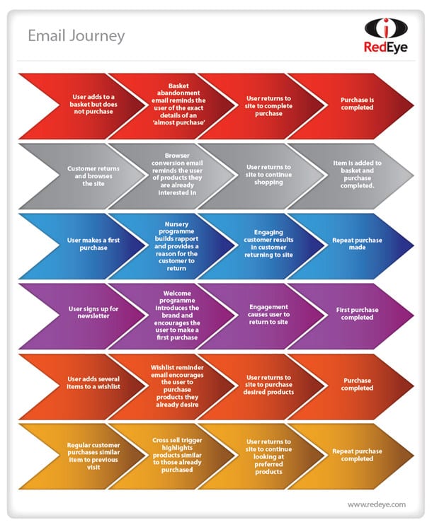 Consider classic behavioural emails like basket abandonment, welcome programmes and browser re-engagement., They all come down to spotting a user’s behaviour (customer journey), which triggers an email brand communication to encourage the user back on to the site (returning to the online customer journey).