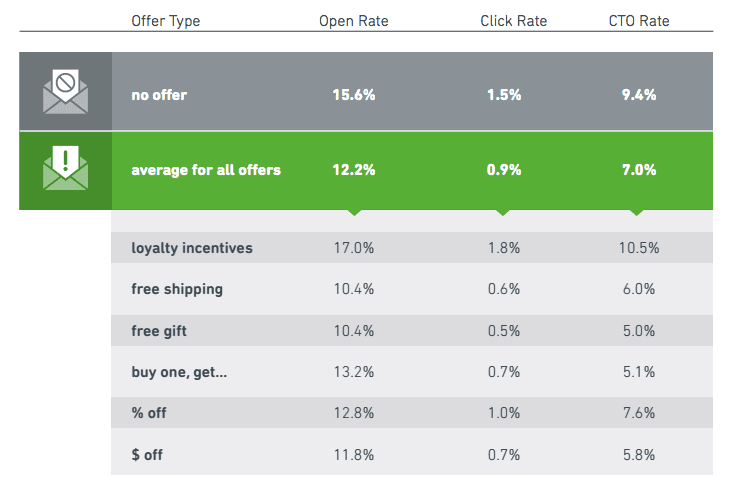 If we look at the average for all the offers compared to no offer at all, it's clear to see that the subject lines with no offer work better with the Click-to-Open (CTO) of 9.4% compared to 7%! This disproves what email marketers have done for years. But if we think about it, it's not surprising. Our customer's inboxes are full of legitimate and spam emails with subject lines offering discounts, or free items. Inboxes are the stuff of nightmares.