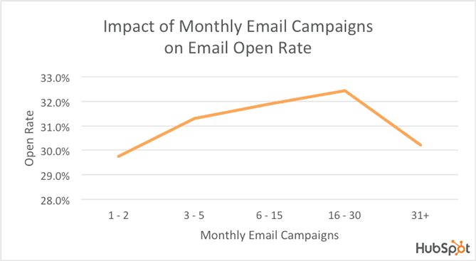- Research by HubSpot shows that businesses that send 16 - 30 emails a month see double the open rate than those that send 2 or fewer emails. It is worth noting that open rates plummet when the number of emails exceeds 31 per month.