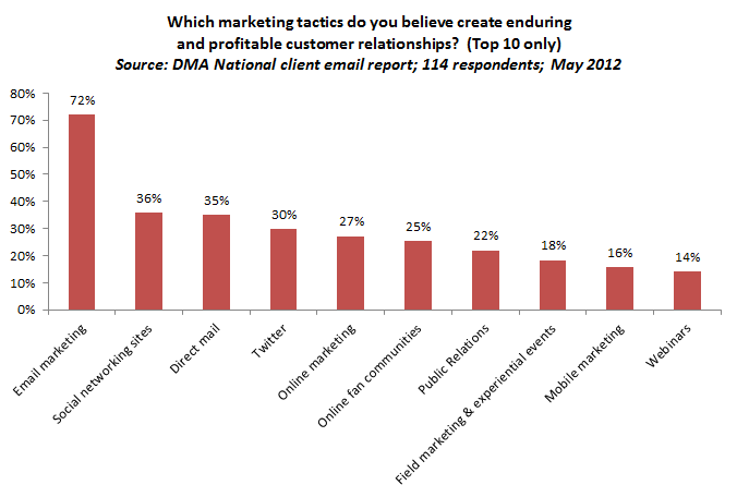 The following chart from the DMA's report shows how respondents perceived email and other alternatives as a relationship-builder...an opinion which is less biased by whether or not they actually use that tactic or channel.