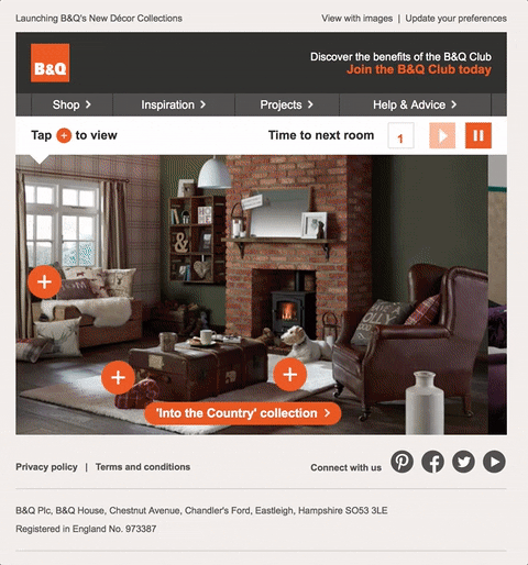 Interactivity doesn't just have to be nifty little features to boost engagement. It can serve a useful purpose for the customer as well. This email from B&Q shows how you can add interactive elements to let your customers explore your offering within the email itself.