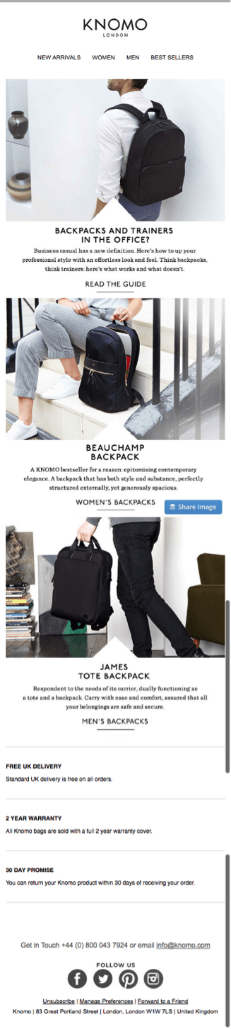 As you can see from the desktop and mobile versions of this email from Knomo, by designing the desktop email with a simple layout with large text and buttons, the mobile version needn't be dramatically different. This saves time and the scalable design means it's sure to work on screens of all sizes.
