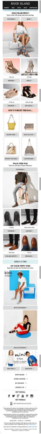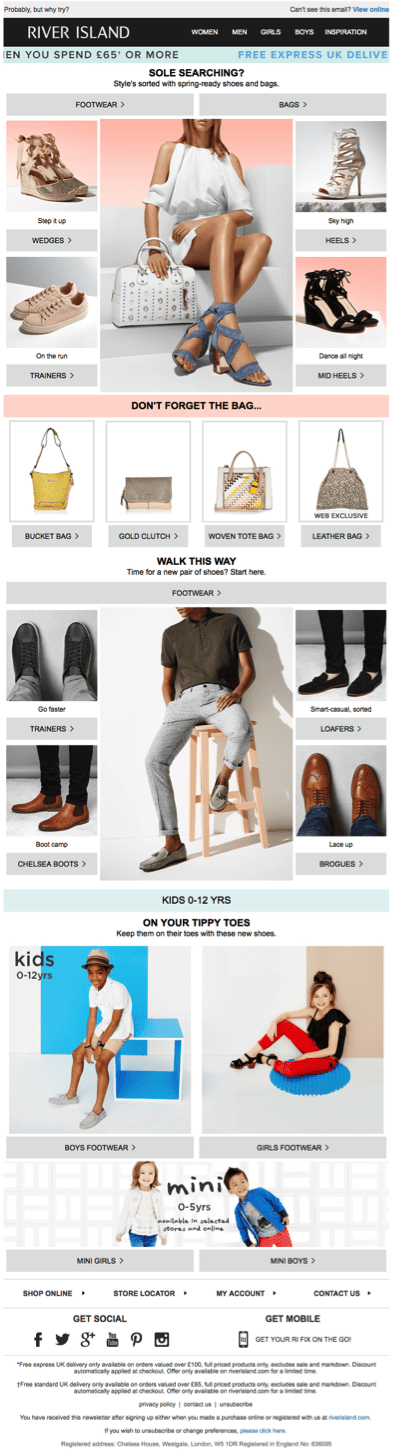 River Island opted to use hybrid or 'spongy' as is it is often called coding to change the layout, usually based on the width of the screen. As you can see from the examples below, the desktop email has a different layout to the mobile version, to make use of the additional screen width.