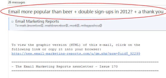 The (full) subject line can also display as a title or headline after the email is opened. As seen here in Hotmail, the impact is particularly strong in a plain text email: