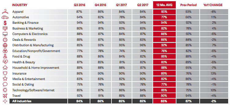 On the flip side, automotive, education/nonprofit/government, and social & dating industries are having a harder time reaching their audience with inbox placement rates of less than 78%.