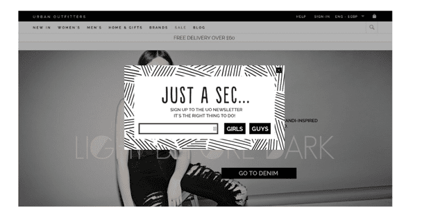 There are possibilities for tailoring the details requested to suit your company without expecting more of the customer though. Urban Outfitters offer a good example of this by cleverly including gender segmentation in their acquisition popover while keeping the customer input minimal.