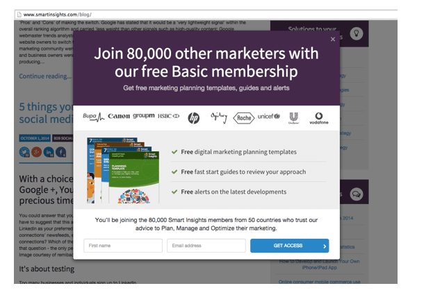 I asked Dave Chaffey about the impact of implementing this and he told me that he had resisted pop-ups for years as a way of encouraging subscribers to the Smart Insights enewsletters. Instead, they used targeted calls-to-action contextual to each section. So, in the email section of the site there is a guide giving tips on email marketing, in the content marketing section and tips on that and so on.
