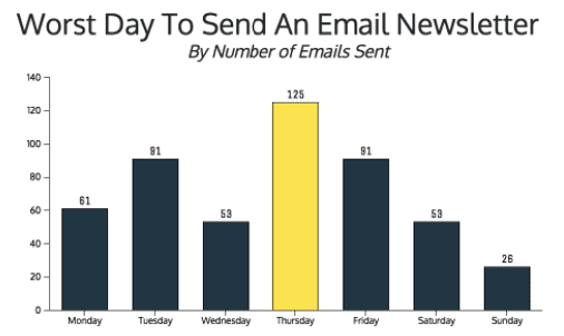 I think that the best day to send an email is on one that has the least competition from other emails - Thursdays had a ton of competition. This is probably caused by some thought leaders Thursdays as the best days to send a newsletter.