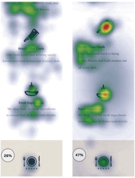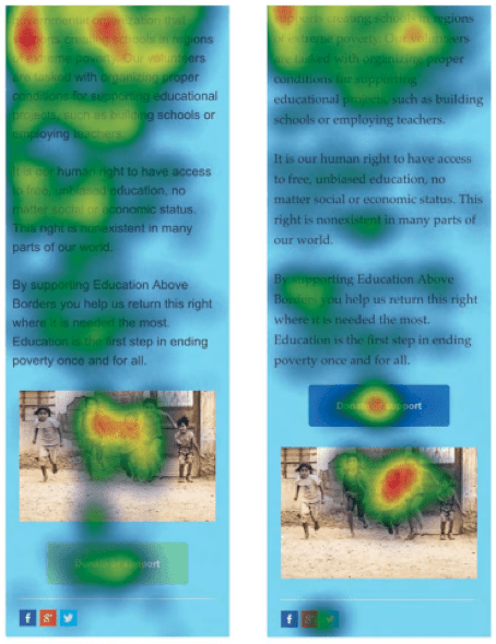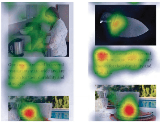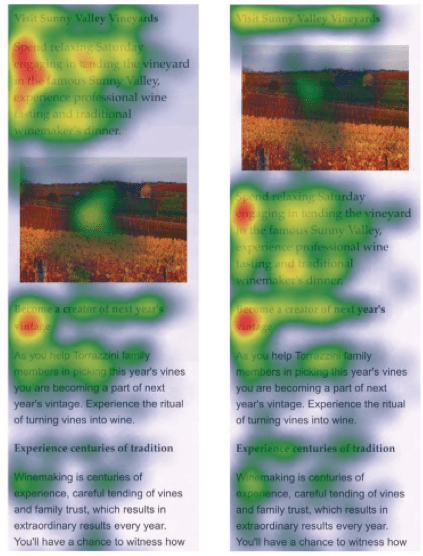 - Position of introductory text. Your introductory text is key for catching the reader’s attention and letting them know what content to expect. You’ll see from the heat map below that the study found that this element is best placed above the image (left) rather than below it (right).